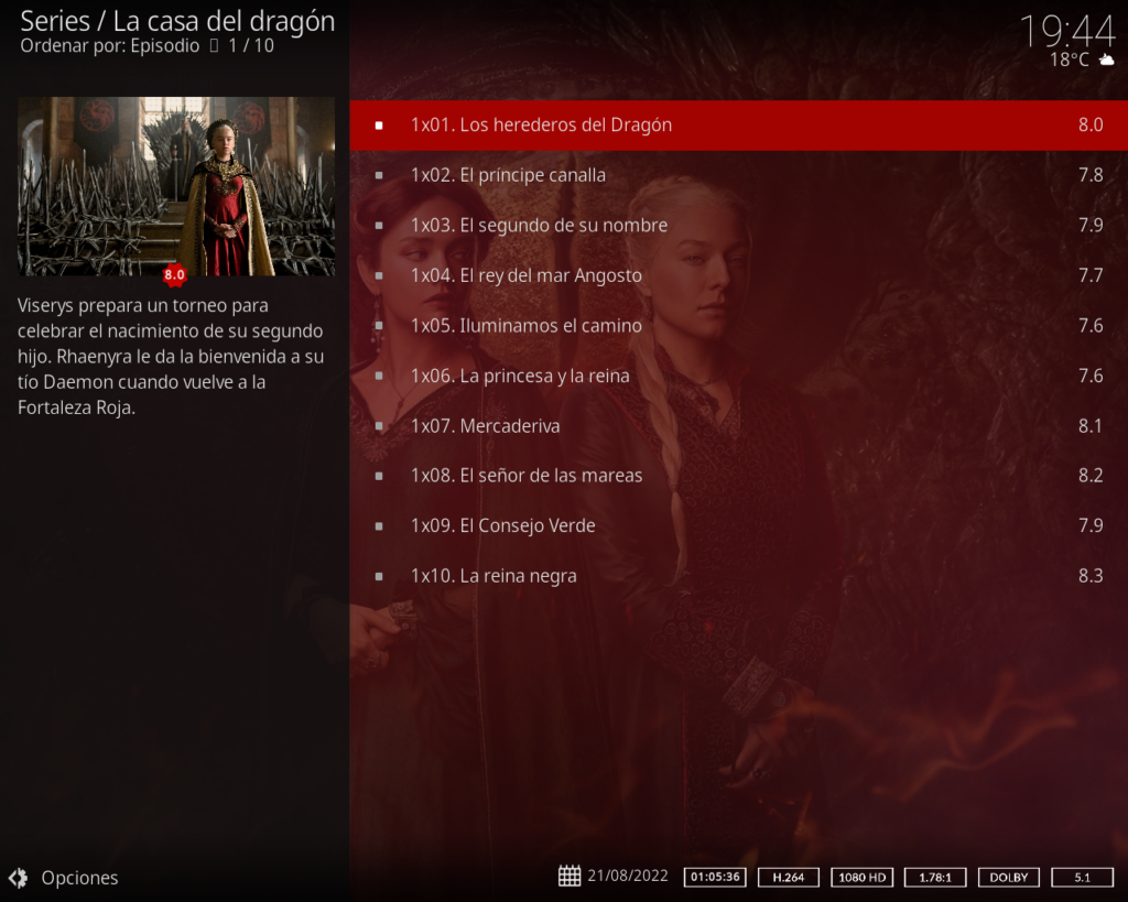 La biblioteca de programas de televisión de Kodi admite vistas de episodios y temporadas con carteles o pancartas, etiquetas vistas, descripciones de programas y actores. Ideal para realizar un seguimiento de su progreso.
